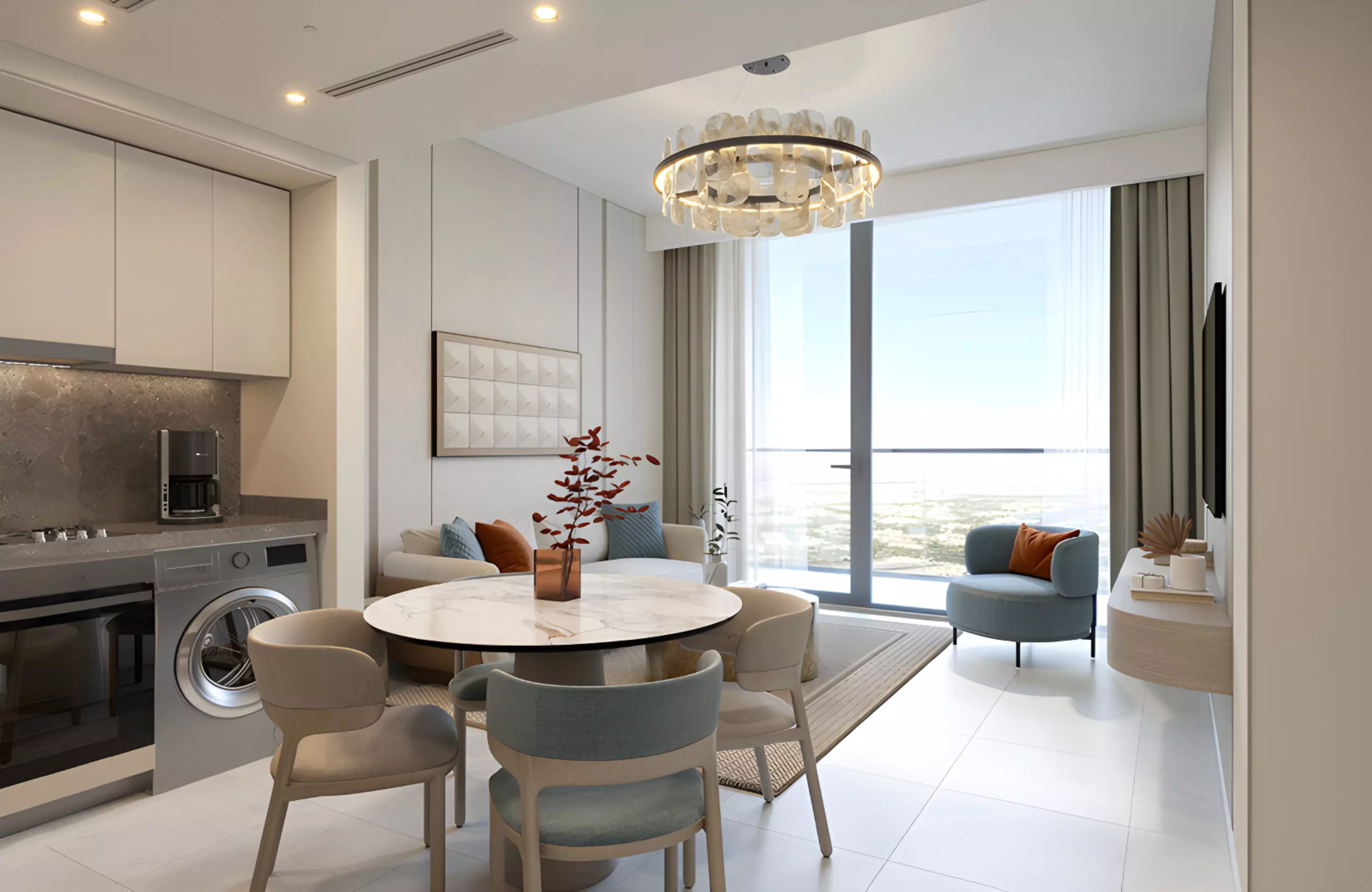 Modern Finishes – Features marble elements, tiled flooring, wooden details, and integrated kitchen appliances.